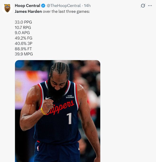 生涯第17个赛季打了常规赛新高的51分钟还拿到40+三双,快船记者都在感谢哈登的付出。美记Daman Rangoola写道:哈登为快船做出的贡献已经超过了科怀-伦纳德。